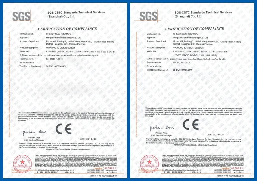 近日,蓝芯科技悟空3D视觉传感器(WUKONG 3D VISION SENSOR)获欧盟CE认证证书。